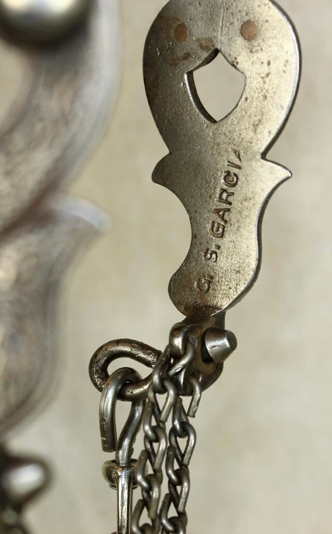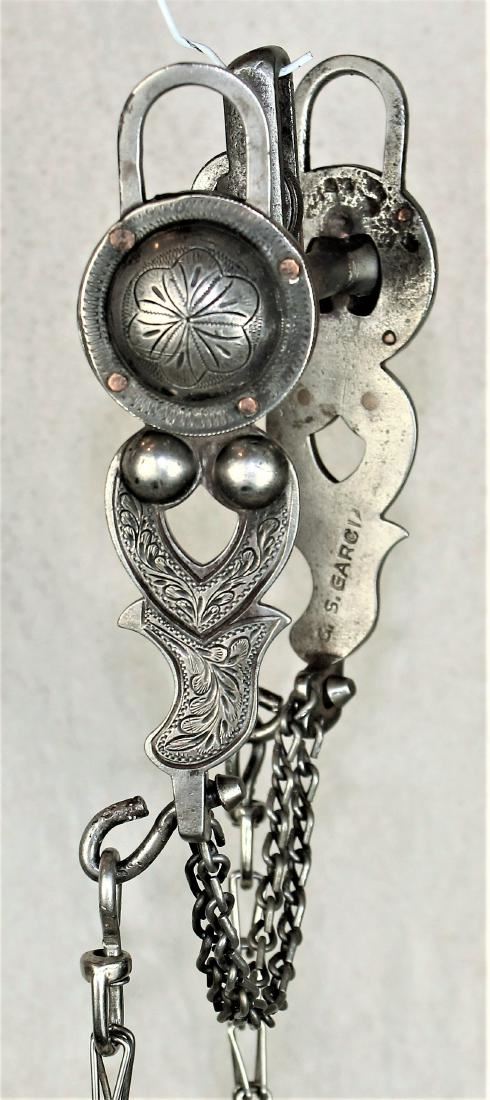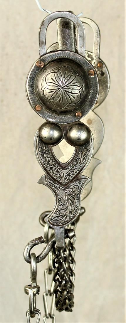 Super nice loose jaw bit with tall halfbreed mouthpeice, having beautifully engraved silver inlaid cut-out cheekpeices in the shape of hearts with great domes and conchos. Nicely maker marked and retaining its original rein chains.
