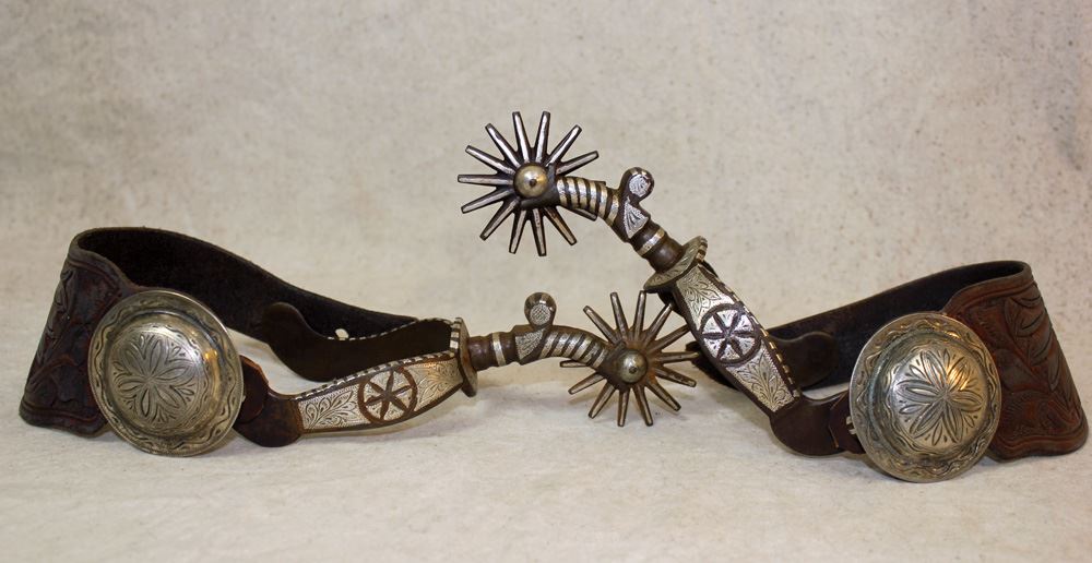 Amazing double silver inlaid spurs in the highly sought after "Dandy" pattern, catalog pattern #75/75A of the 1898 Garcia Saddlery catalog, with finely engraved silver and great period straps.
