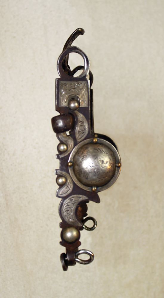 Wonderful early loose jaw spade bit with unusual inlay and conchos and having very nice mark on inside of cheek with reverse "N".
