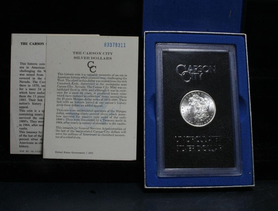 Very nice example with good eye appeal. After the US Government audited its vaults in the mid 70's they found a Hoard of Morgan Dollars in the basement vault in the federal reserve. Between 1973 and 1980 the Government Services Administration (GSA) Packaged these rare Morgan dollars and auctioned them off to the public. This example is the 1883-cc Carson City Morgan with the original box and the 2 piece COA. Estimated Value $250