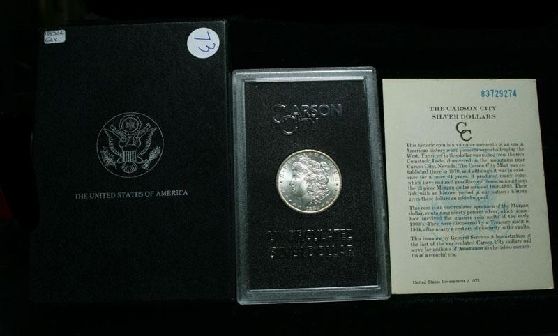 Very nice example with good eye appeal. After the US Government audited its vaults in the mid 70's they found a Hoard of Morgan Dollars in the basement vault in the federal reserve. Between 1973 and 1980 the Government Services Administration (GSA) Packaged these rare Morgan dollars and auctioned them off to the public. This example is the 1883-cc Carson City Morgan with the original box and the COA. Estimated Value $250