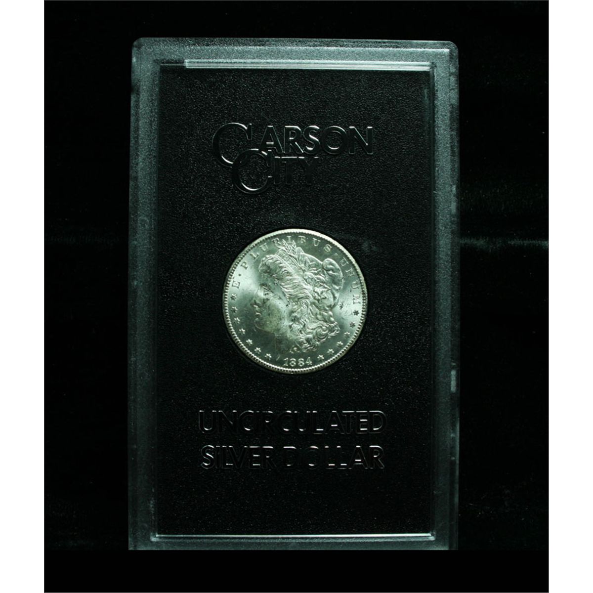 A Nice Blast White example with Great Luster. This is also the VAM 5. It is an awesome variety. It is the "cc/cc (the first cc is quadrupled) and has a wild doubled 1". After the US Government audited its vaults in the mid 70's they found a Hoard of Morgan Dollars in the basement vault in the federal reserve. Between 1973 and 1980 the Government Services Administration (GSA) Packaged these rare Morgan dollars and auctioned them off to the public. This example is the 1884-cc Carson City Morgan with the original box and the COA. Estimated Value $275