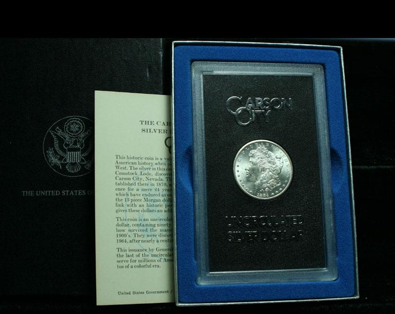 After the US Government audited its vaults in the mid 70's they found a Hoard of Morgan Dollars in the basement vault in the federal reserve. Between 1973 and 1980 the Government Services Administration (GSA) Packaged these rare Morgan dollars and auctioned them off to the public. This example is the 1884-cc Carson City Morgan with the original box and the COA. Estimated Value $275