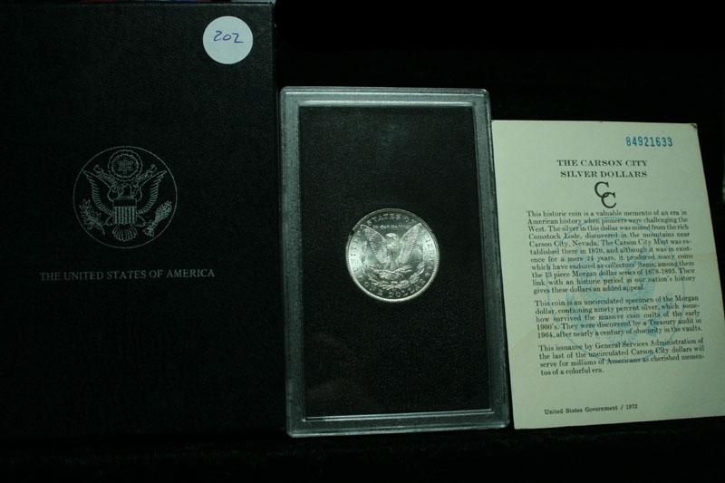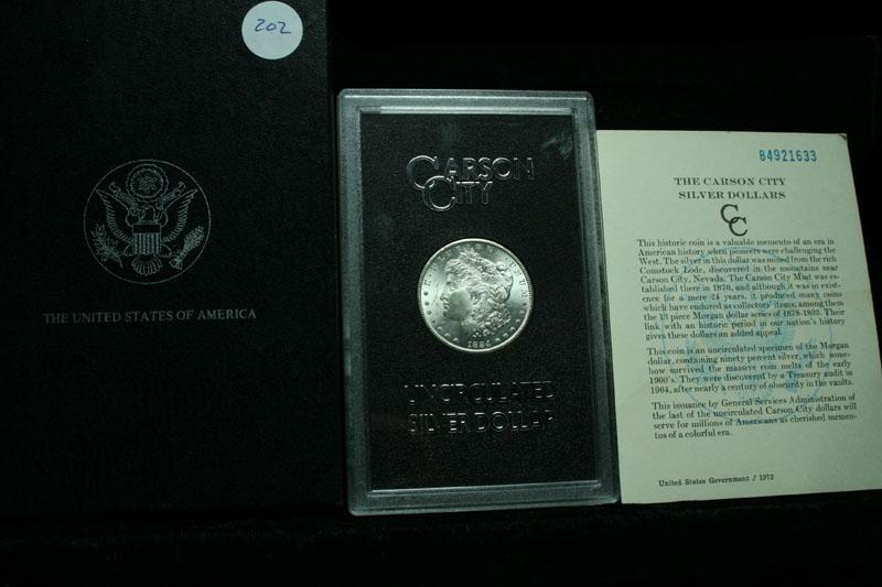 After the US Government audited its vaults in the mid 70's they found a Hoard of Morgan Dollars in the basement vault in the federal reserve. Between 1973 and 1980 the Government Services Administration (GSA) Packaged these rare Morgan dollars and auctioned them off to the public. This example is the 1884-cc Carson City Morgan with the original box and the COA. Estimated Value $275