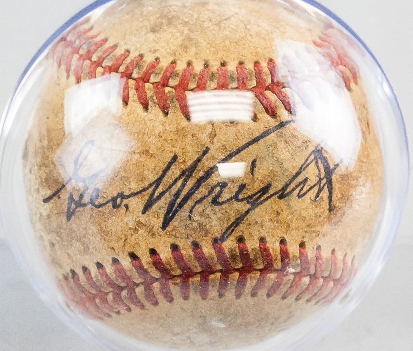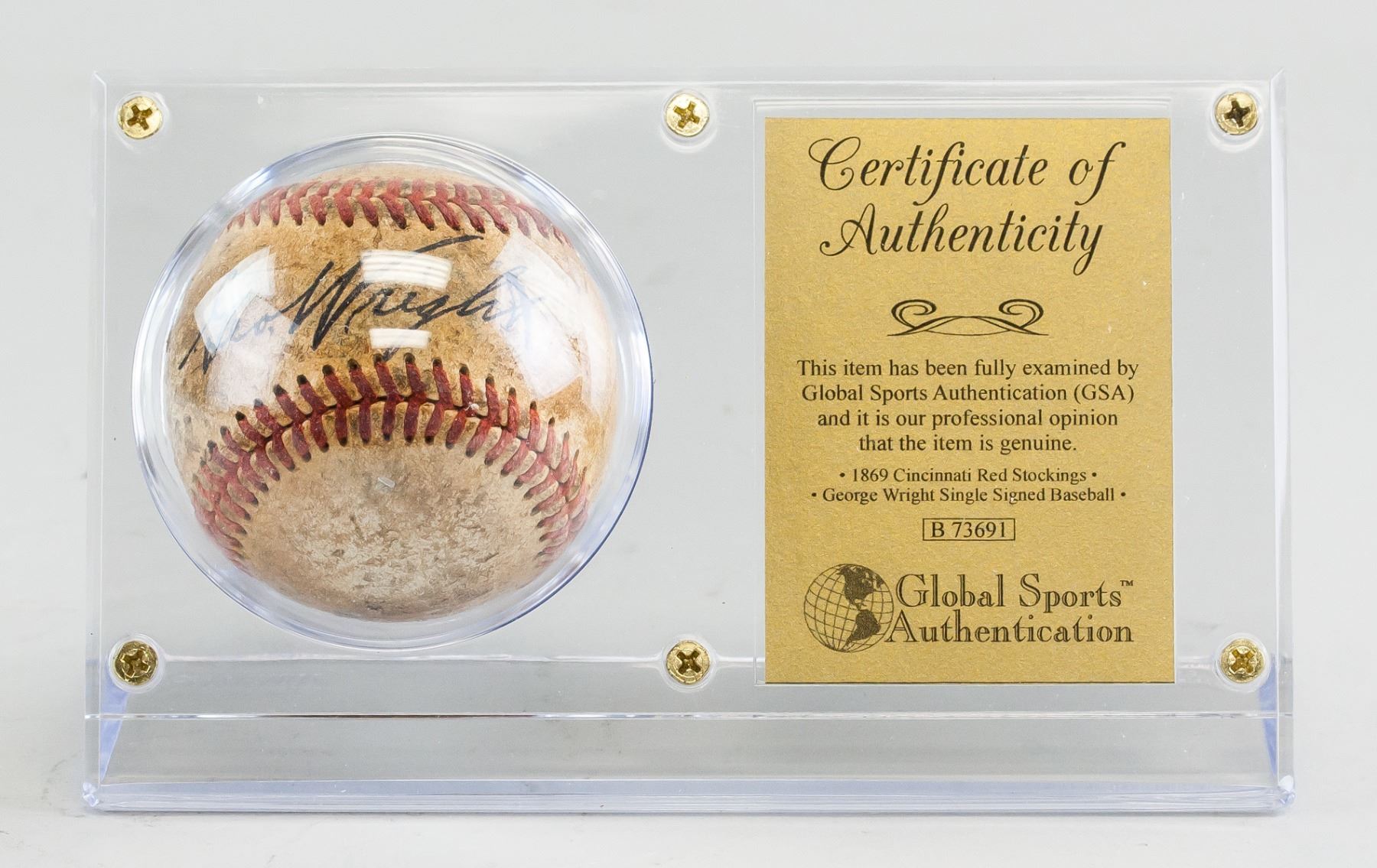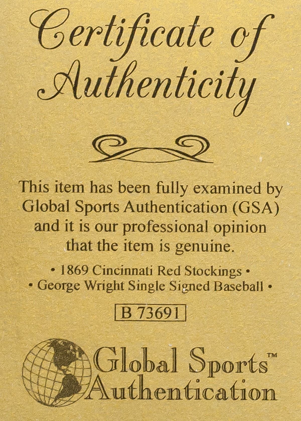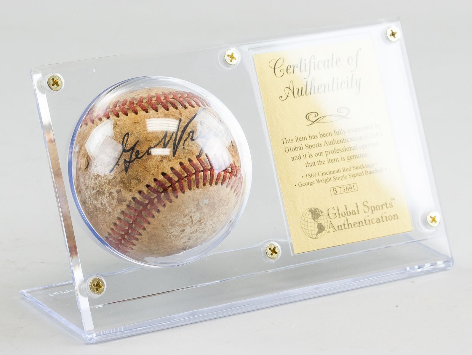 Autographed baseball. Signed George Wright. Accompanied with GSA certificate of authenticity. Diameter: 7cm. Photograph not included