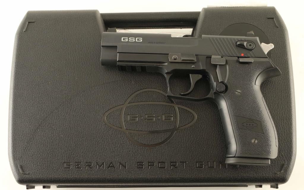 Double-action semi-automatic rimfire pistol chambered in .22 Long Rifle, manufactured in Germany by GSG, imported by American Tactical, Summerville SC. This same model was previously marketed as a "SIG Mosquito". Features a matte black finished aluminum-zinc alloy slide, 4" barrel, high contrast three-dot sights with drift adjustable rear sight, smooth polymer trigger, serrated round hammer spur, decocker on the left side of the frame, ambidextrous safety on the slide, internal key lock safety, push button magazine release, black polymer frame with accessory rail, and two-piece textured black synthetic grips. Includes the original factory hard case with manual, (1) magazine. Pistol retains approximately 99% of its original finish showing minor scuffs with no major wear observed. Action is smooth, the bore is pristine and the synthetic grips are fine. Condition is NRA Excellent - like new *** Modern Firearm ***