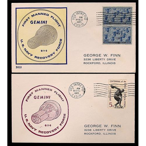 <Our item number 139771><B>GT-3, 1965, Recovery Covers.</B> Lot of two similar covers including one with a printed yellow/blue cachet (#B515) and the other with a magenta US Navy Recovery Force handstamped cachet. Both covers have USS Intrepid machine cancels and printed addresses. A clean lot. <BR>Estimated Value $150 - 250. <BR><BR>Our item number 139771<BR><IMAGES><P ALIGN="CENTER"><IMG SRC="http://www.goldbergcoins.net/liveauction/49jpegs/139771.jpg"> </P></IMAGES>
