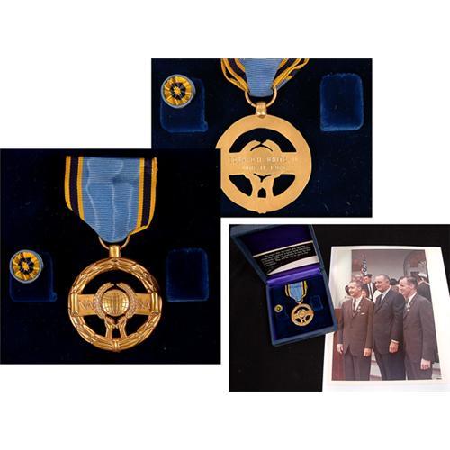 <Our item number 139869><B>GT-4, 1965, Ed White II's NASA Exceptional Service Medal.</B> This NASA medal is mounted in its unique blue/gold box with the name "Edward H. White II" inscribed on the box. The medal is inscribed on its reverse: "Edward H. White II / June 11, 1965". This medal was awarded to White only 3 days after the splashdown.<BR><BR>The medal box includes a printed enclosure that reads: "We regret that the lapel pin, and the ribbon rosette (which is being hand-fabricated in France) were not available in time for this ceremony. They will be sent you in the future". We have not encountered this label before. It shows how unprepared NASA was to honor Ed White's "Walk in Space". The missing rosette and lapel pin were subsequently supplied as the rosette alone is included with this medal. The lapel pin, worn extensively by White on official occasions, has been misplaced in the fog of history.<BR><BR>To have the opportunity to acquire a NASA medal, ins cribed to and issued to the astronaut who performed one of the iconic milestones in America's space history (the others would include Alan Shepard, John Glenn, Neil Armstrong and Buzz Aldrin) is a once-in-a-lifetime opportunity. A color photocopy of a NASA photo of McDivitt and White wearing their NASA Exceptional Service medals and standing alongside President Johnson after he awarded them their medals, is included.<BR><BR>This lot is a truly unique piece of space history. A portion of the proceeds of the sale of this medal will be given to the White Family Foundation at the University of Michigan. <BR>Estimated Value $7,500 - 10,000. <I><BR>Ex. the Ed White Family collection.</I> <BR><BR>Our item number 139869<BR><IMAGES><P ALIGN="CENTER"><IMG SRC="http://www.goldbergcoins.net/liveauction/49jpegs/139869.jpg"> </P></IMAGES>