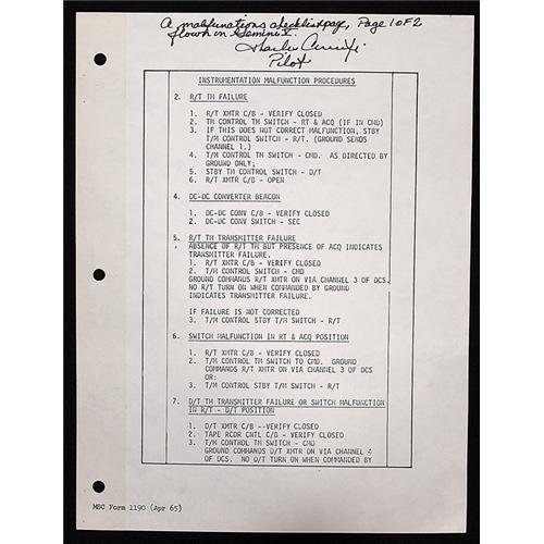 <Our item number 139792><B>GT-5, 1965, FLOWN Checklist Page.</B> (8x10.5") An "Instrumentation Malfunction Procedures" checklist page (one sided) inscribed at the top by astronaut Charles Conrad: "A malfunctions checklist page, Page 1 of 2, flown in Gemini V, Charles Conrad, Pilot". Attractive and unique. <BR>Estimated Value $1,000 - 1,500. <BR><BR>Our item number 139792<BR><IMAGES><P ALIGN="CENTER"><IMG SRC="http://www.goldbergcoins.net/liveauction/49jpegs/139792.jpg"> </P></IMAGES>