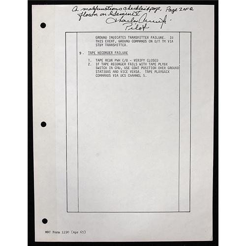 <Our item number 139793><B>GT-5, 1965, FLOWN Checklist Page.</B> (8x10.5") An "Instrumentation Malfunction Proceedures" checklist page (one sided) inscribed at the top by astronaut Charles Conrad: "A malfunctions checklist page, Page 2 of 2, flown in Gemini V, Charles Conrad, Pilot". Attractive and unique. <BR>Estimated Value $1,000 - 1,500. <BR><BR>Our item number 139793<BR><IMAGES><P ALIGN="CENTER"><IMG SRC="http://www.goldbergcoins.net/liveauction/49jpegs/139793.jpg"> </P></IMAGES>