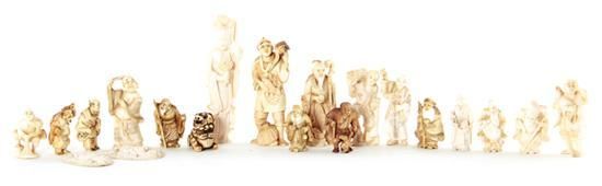 Collection carved ivory netuske, figural sculptures and medallions late 19th/early 20th century, various okimono figures and medallions. H1 1/2in to 5 1/4in (20pcs) Provenance: Charlotte, North Carolina estate.