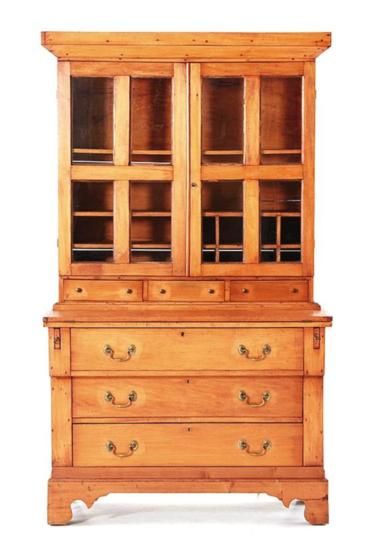 American Cherry writing desk and bookcase 19th century, square cornice upon four-light doors opening to shelves and pigeonholes above three drawers upon bottom case with fold-out writing surface on three drawers terminating in scalloped apron flanked by ogee bracket feet. H68 3/4in W40in D19 1/2in Provenance: Charlotte, North Carolina estate.