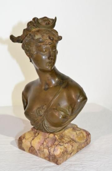 FRENCH BRONZE BUST OF DIANA SIGNED A. CARRIER, BELLEUSE WITH FRENCH FOUNDRY & MARBLE BASE - 7 1/2inches x 5 1/2inches