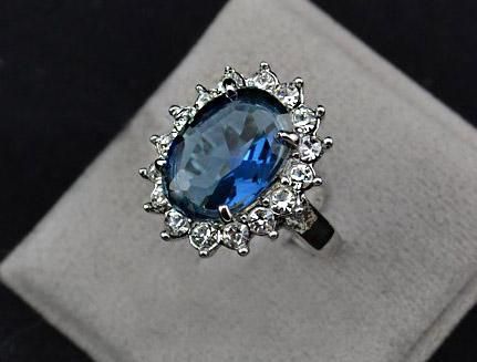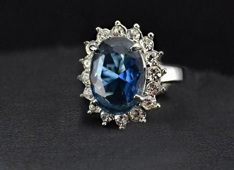 Princess Dianas Style Engagement Ring, blue and white crystals, Rhodium plated, ring measures 7.5