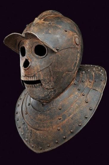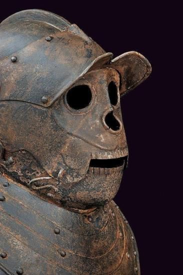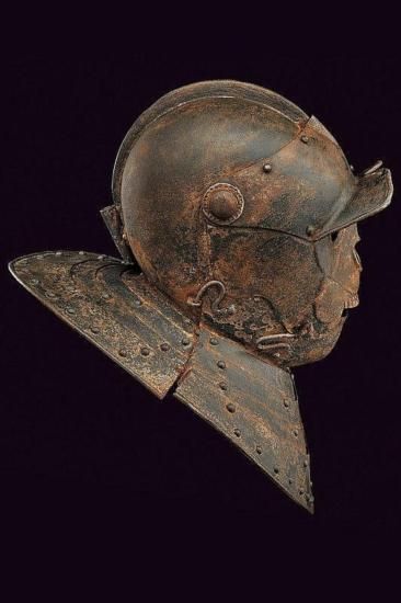 GT0607120024 A Savoyard type helmet One-piece skull, movable chanfrin with roped brim, ventail with anthropomorphic face, circular eye-slots and air holes, beaver with hooks. Four-plate nape -and neck-guard. dimensions: height 44 cm. provenance: Europe , dating: 18th Century