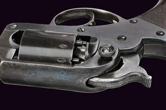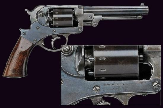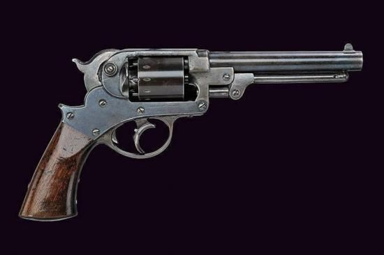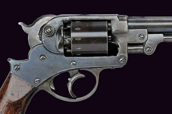 GT0607120028 A Starr Arms Co. D.A. 1858 Army Revolver Round, rifled, 44 cal. barrel, with foresight, stamped on both sides of the base; cylindrical, six-shot cylinder with serial number ~16289~, frame marked ~STARR ARMS Co. NEW YORK~ on the left, ~STARR'S PATENT JAN. 15 1856~ on the right, trigger guard stamped ~B~; wooden grip with remains of stamps at the lower part. _dimensions: length 29 cm. _provenance: USA _dating: third quarter of the 19th Century