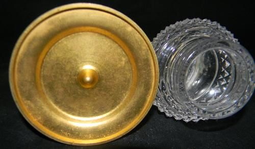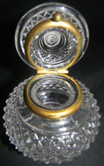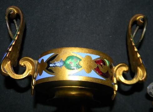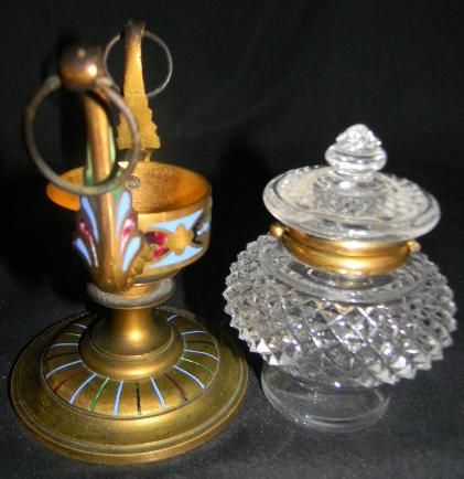GT0611120003 ANTIQUE 1880s CHAMPLEVE ENAMEL ORMOLU CUT GLASS INKWELL. AN UNUSUAL ANTIQUE, CIRCA 1880s, PEDESTALED AND LEAF SCROLL HANDLED INKWELL STAND. THE ORMOLU BRASS IS WITH CHAMPLEVE ENAMELS ON THE BASS FOOT, THE COLLAR FOR THE INKWELL HOLDER, AND THE HANDLES. THE INKWELL WITH MOUNTED LID IS OF DIAMOND POINT PATTERN CUT GLASS. UNMARKED, PROBABLY FRENCH MADE. IT MEASURES 6in TALL BY 4in WIDE AT HANDLES. THE INKWELL ALONE MEASURES 3-7/8in TALL BY 3in DIAMETER. EXCELLENT CONDITION: BRASS WITHOUT DENTS OR BREAKS, ORIGINAL ORMOLU FINISH WITH SLIGHT PATINA.