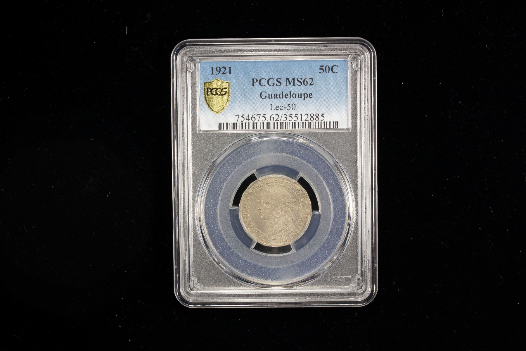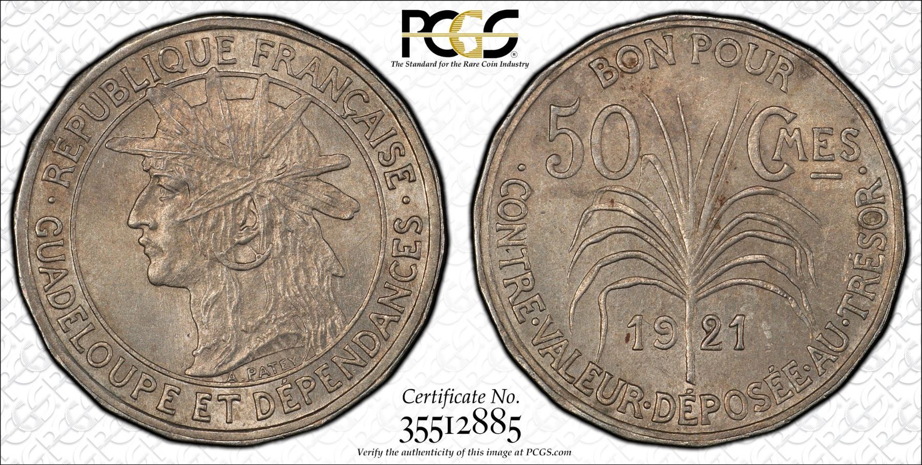 GUADELOUPE: French Colony, 50 centimes, 1921, KM-45, Lecompte-50, Arawak man with feathers on his headband, two year type, PCGS graded MS62.
