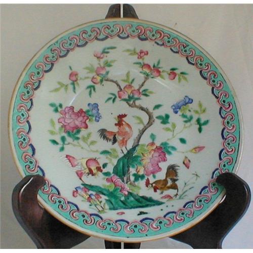 GUANGXU Chinese FAMILLE ROSE deep charger with three bold cockerels, one in a fruiting peach tree, the others in the garden among multi-colored flowers in a pretty garden. Enamels are especially nice and the impressive size is hard to find in a deep plate of this caliber. Reverse has detailed iron red floral scrolls.
