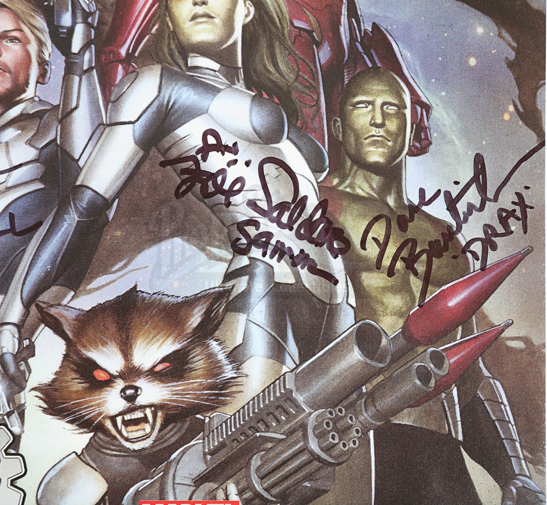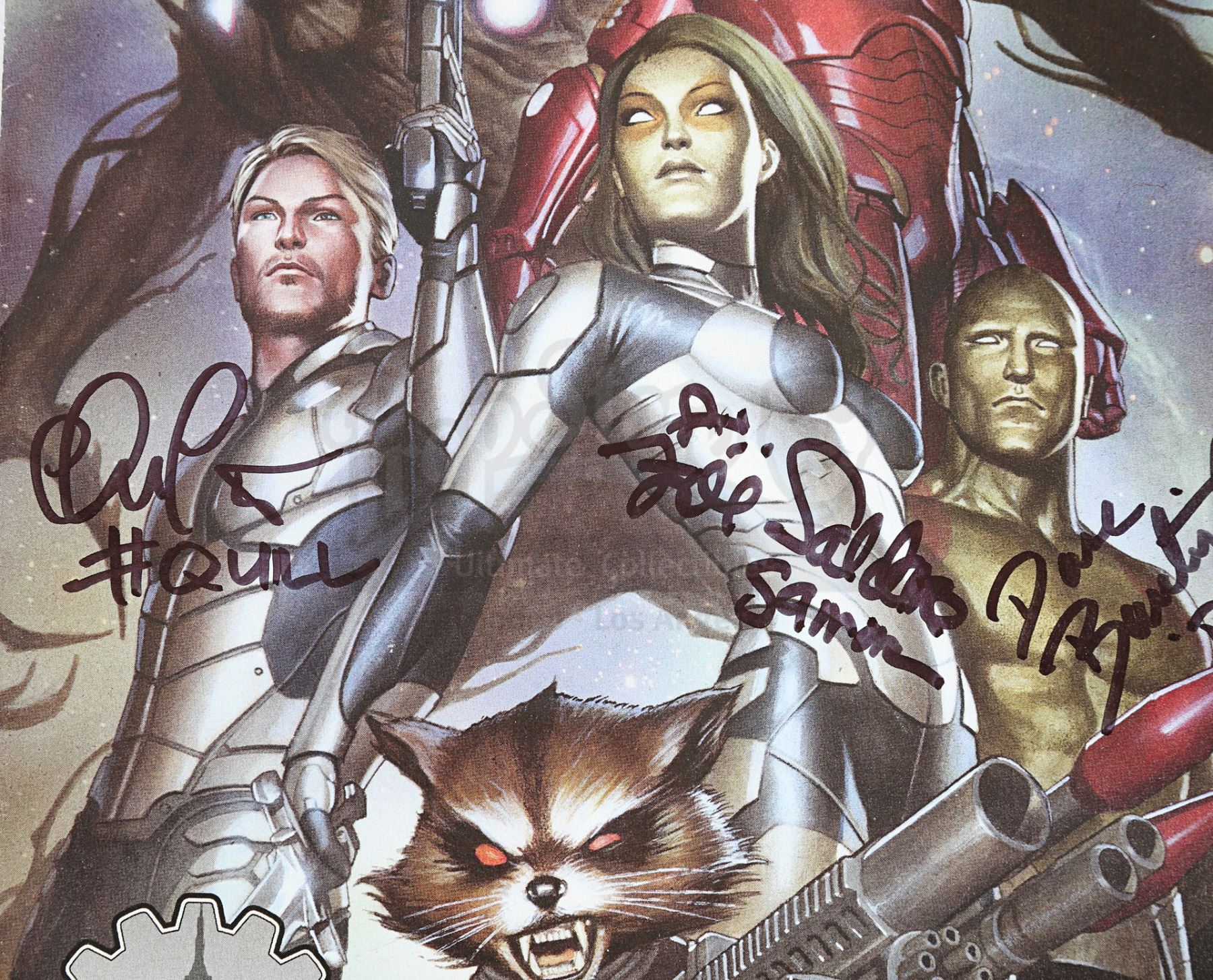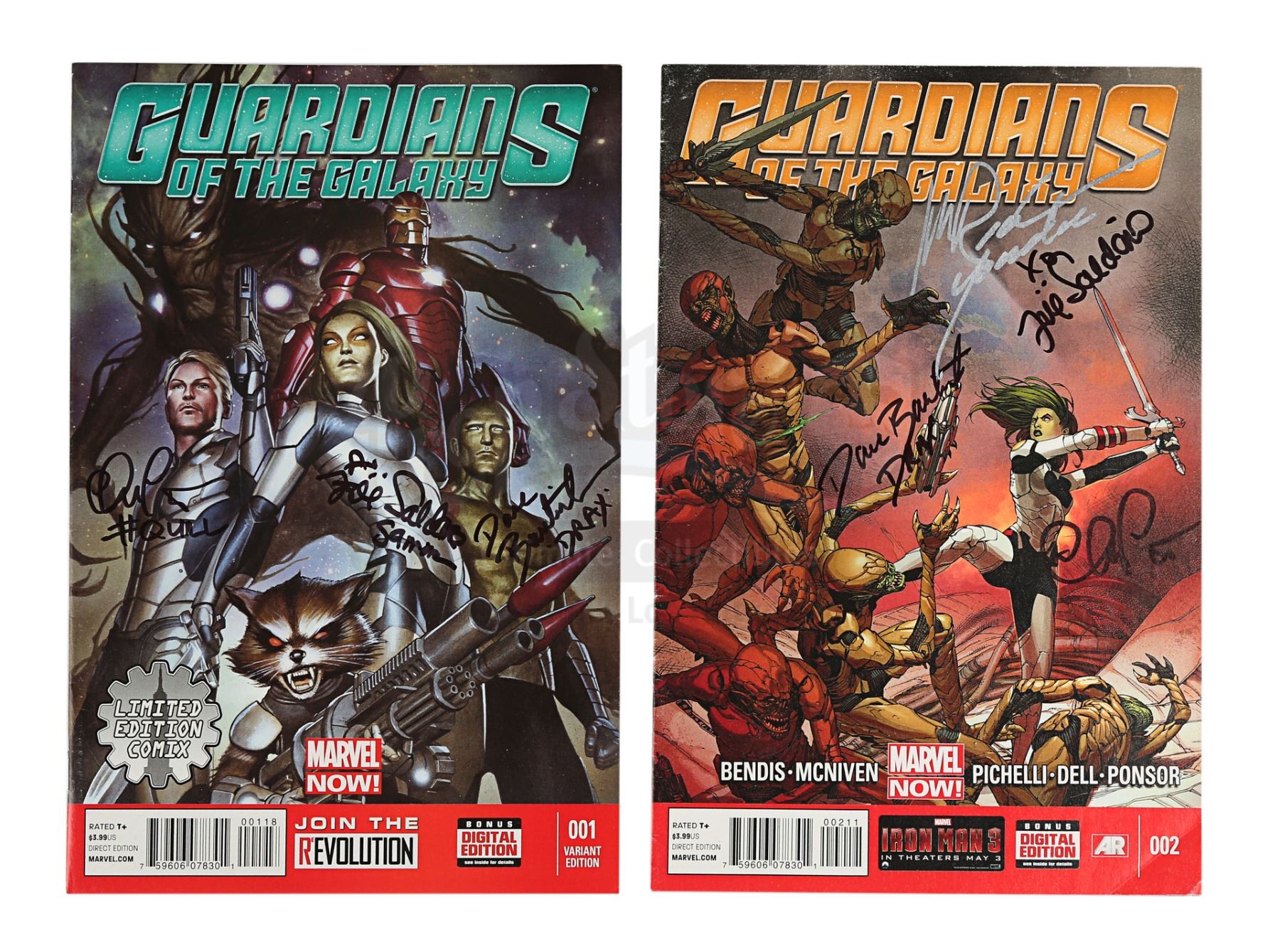 A pair of cast-autographed comic books from the promotion of James Gunn's sci-fi comedy adventure Guardians of the Galaxy. Both comics - from a limited-edition run - have been autographed in black marker pen by Chris Pratt, Zoe Saldana and Dave Bautista. Michael Rooker has also autographed one of them with a silver pen. The comics have very minor wear around the edges and corners of the covers. Dimensions (each comic): 26 cm x 17 cm (10 1/4" x 6 3/4")