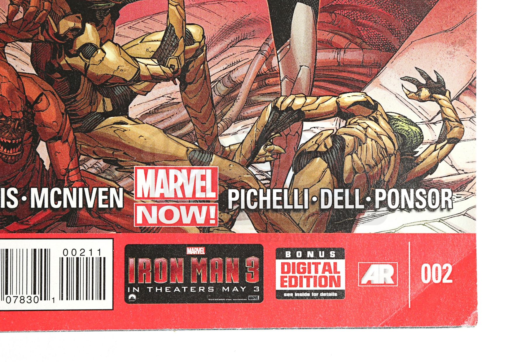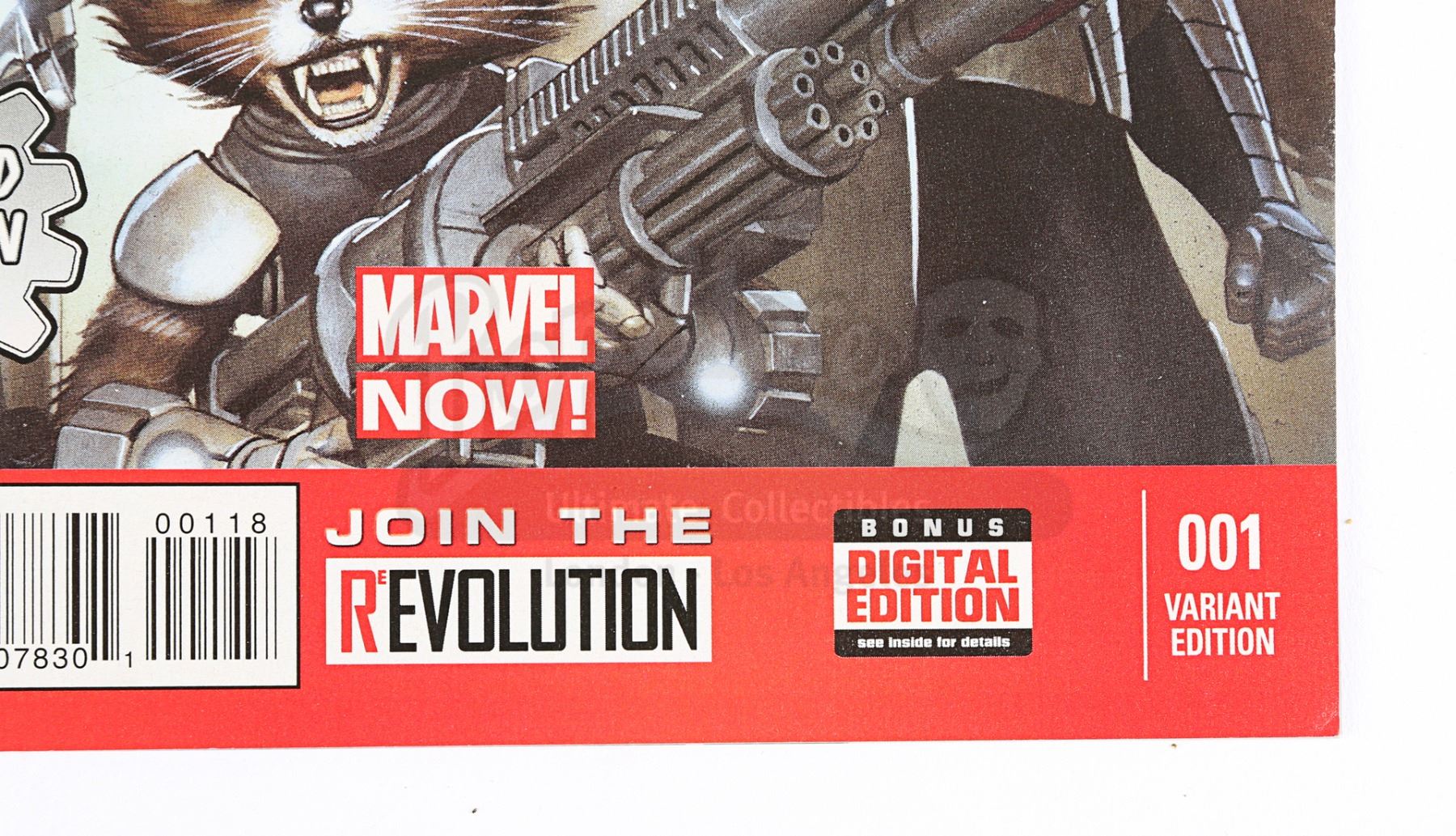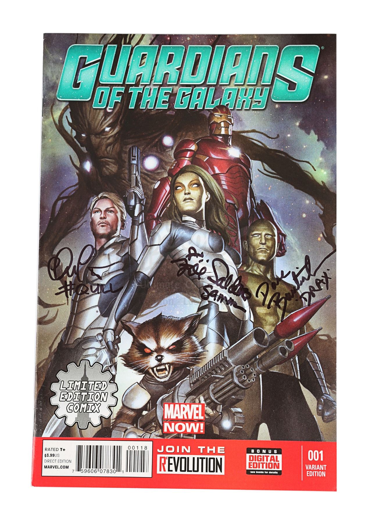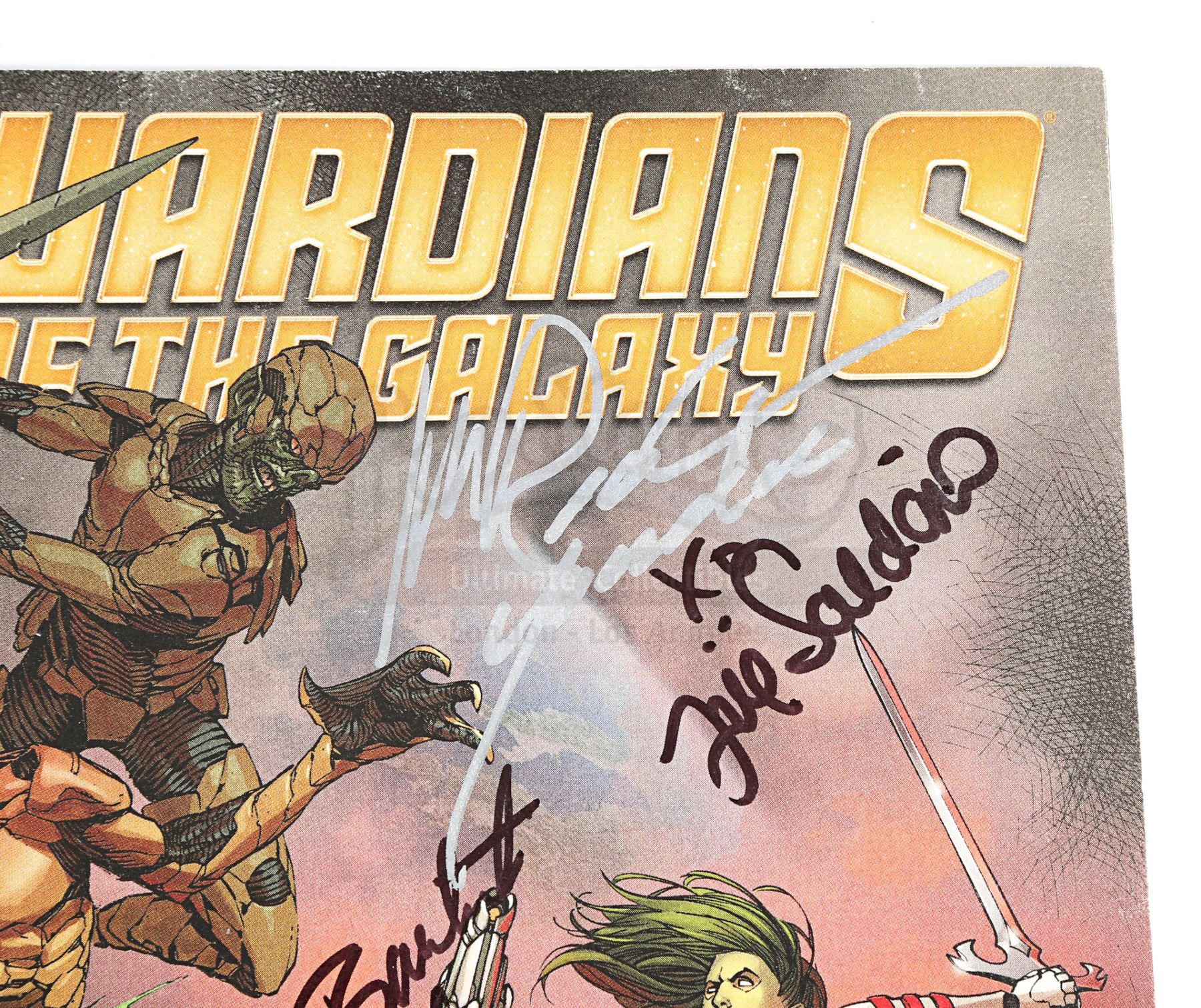 A pair of cast-autographed comic books from the promotion of James Gunn's sci-fi comedy adventure Guardians of the Galaxy. Both comics - from a limited-edition run - have been autographed in black marker pen by Chris Pratt, Zoe Saldana and Dave Bautista. Michael Rooker has also autographed one of them with a silver pen. The comics have very minor wear around the edges and corners of the covers. Dimensions (each comic): 26 cm x 17 cm (10 1/4" x 6 3/4")