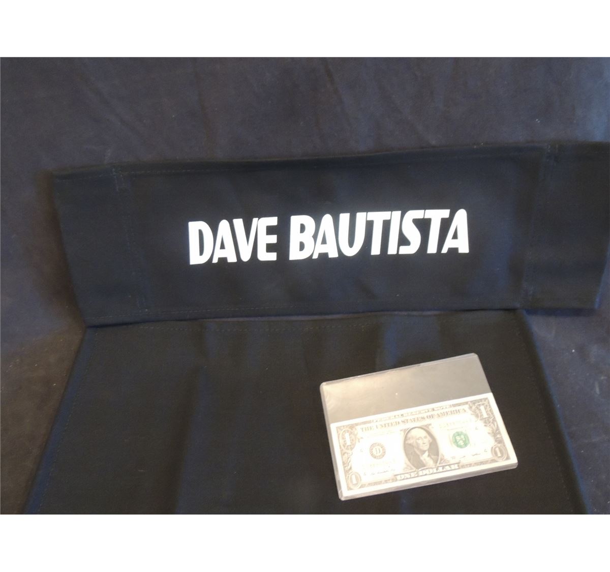 This is the OOAK cloth back and seat off the director chair Dave Bautista used during filming as DRAX! Says Dave Bautista on the front and GUARDIANS OF THE GALAXY on the back.