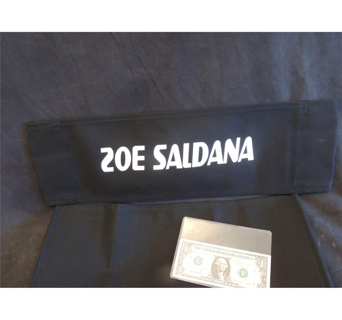 This is the OOAK cloth back and seat off the director chair Zoe Saldana used during filming as GAMORA! Says Zoe Saldana on the front and GUARDIANS OF THE GALAXY on the back.
