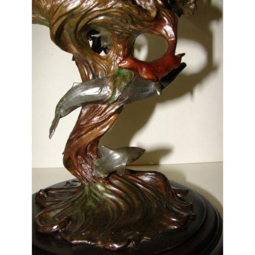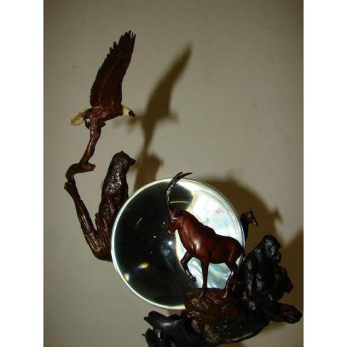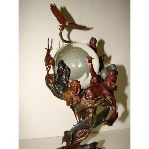 STEVEN D. LORD GUARDIANS OF THE WORLD CRYSTAL BALL SCULPTURE. Presented by Conservation International. Bronze sculpture is decorated with shark, whale, dolphin, sea otter, owl, elephant, bear, tiger, giraffe, lion, gorilla, gazelle, wolf, and bald eagle on base. Sculpture holds a clear glass crystal sphere. Tip of right wing on bald eagle shows one small chip. Marked on bottom of base. 15.5” H