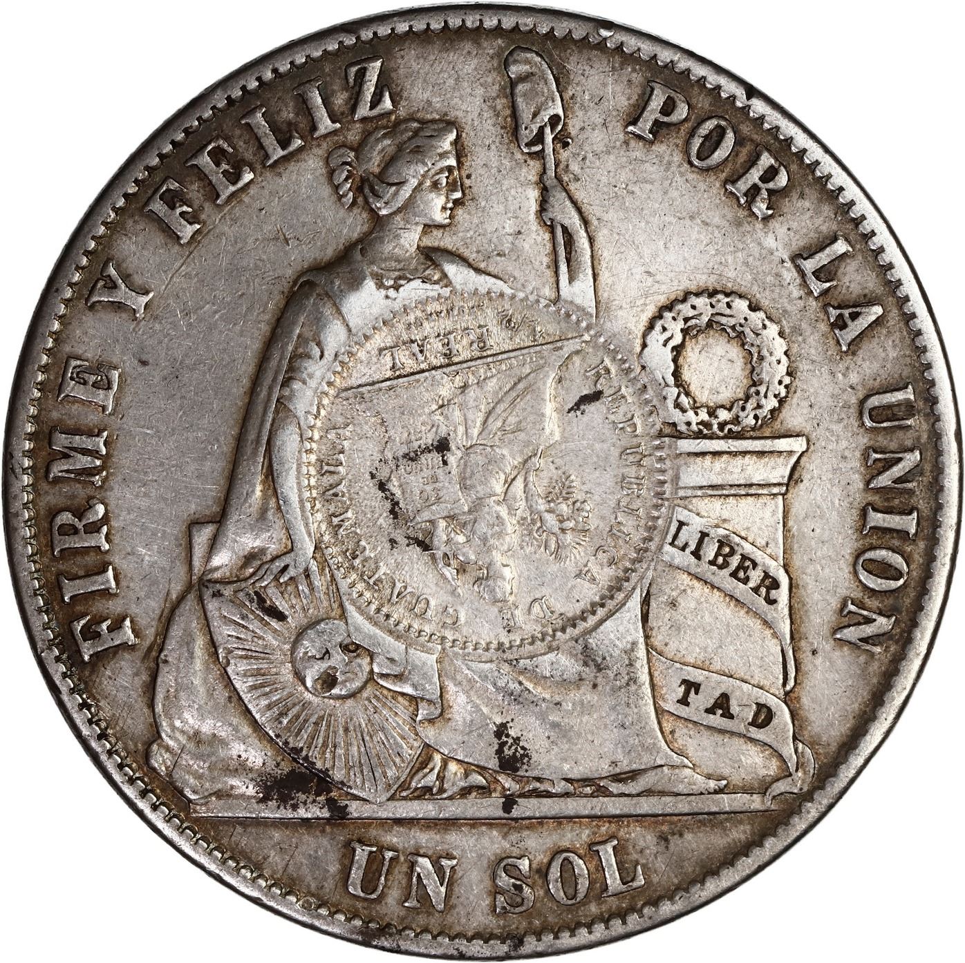 GUATEMALA, 1 peso, "½ real" counterstamp of 1894 on a Lima, Peru, 1 sol, 1873 LD. KM-196. 24.82 grams. Nice, full AU countermark with sharp details struck on a XF host coin, some hairlines in the fields.