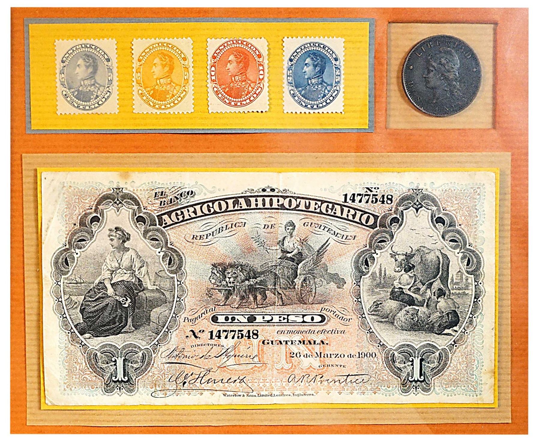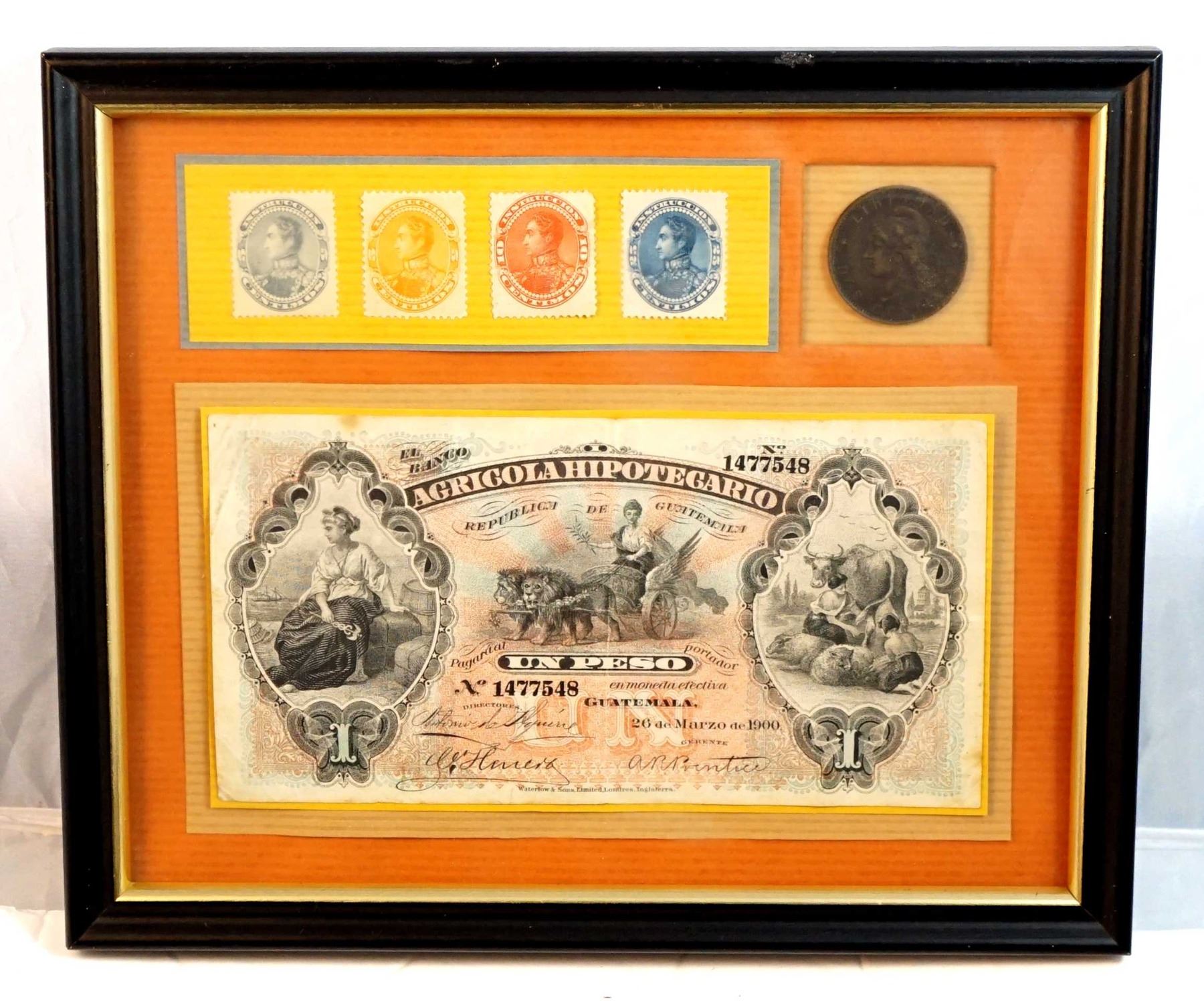 GUATEMALA 1900. A Framed set of Stamps, Banknote and Coin Very Fine