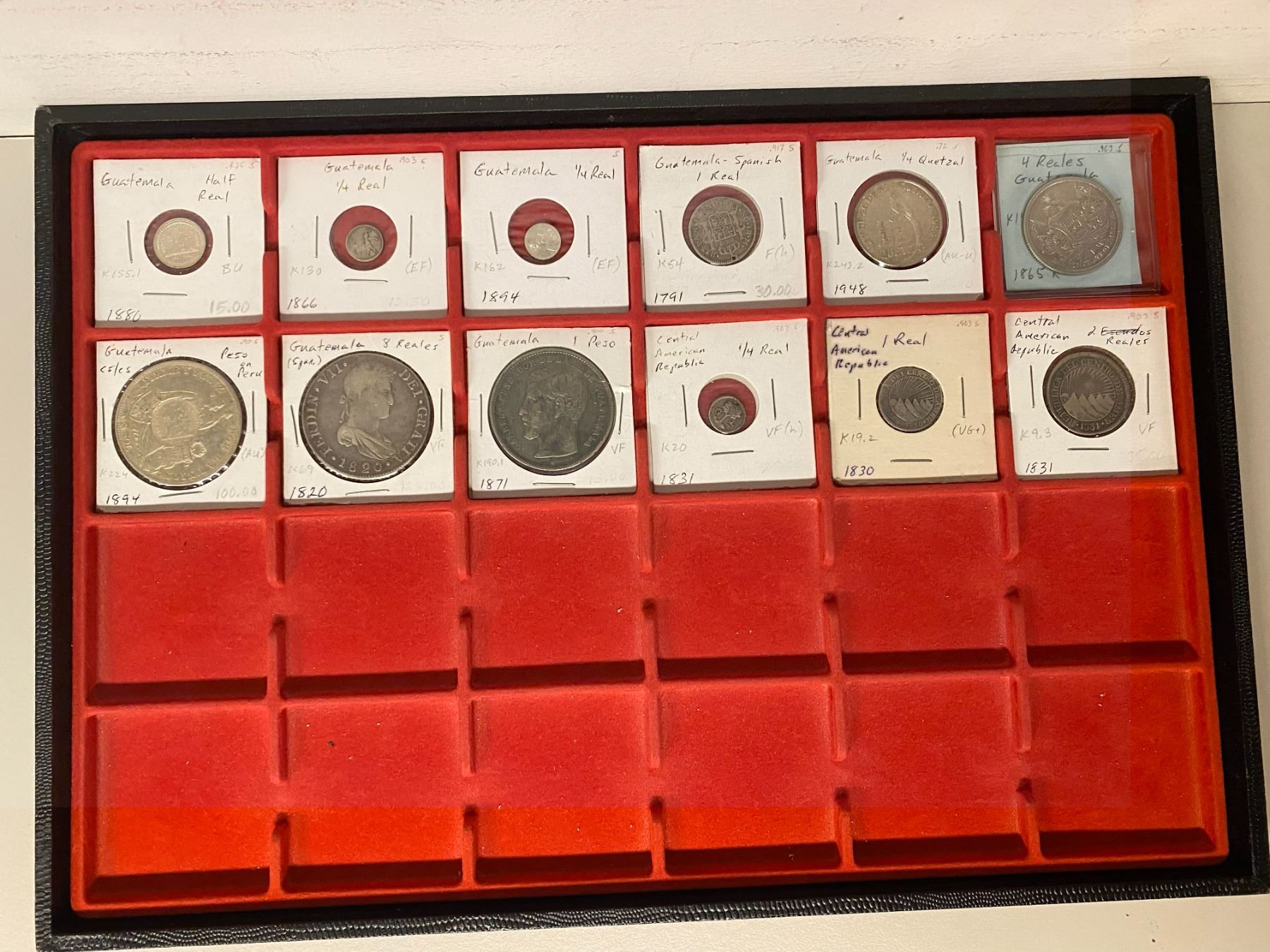 GUATEMALA: LOT of 12 AR coins, including 3 of the Central American Republic (1831 1/4 real, 1830 1 real, and 1831 2 reales F-VF), an 1871 peso (VF), an 1820 8-reales, an 1865 4-reales, a countermarked 1894 Peru sol (AU), and 5 others; retail value $750, lot of 12 pieces.