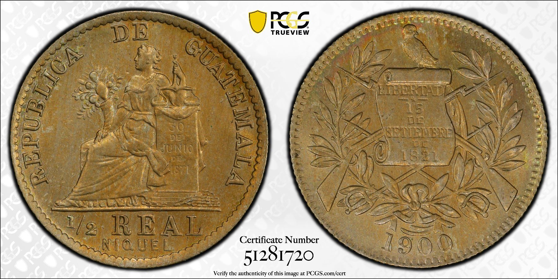 GUATEMALA: Republic, 1/2 real, 1900, KM-176, a wonderful lustrous example! PCGS graded MS64.