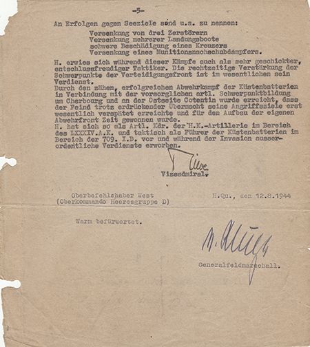 (1882 - 1944) "Cunning Hans", Nazi general who led a field army in Poland, Belgium, France and Russia where he headed the most powerful army in the center, nearly took Moscow, later committed suicide. Fine content partial D.S., 1p. 4to., Aug. 12, 1944, the last page of a listing of damage done to Allied material following the D-Day landing. In part: "...The following successes are noted...against sea targets. Sinking of three destroyers...Heavy damage of a cruiser...H. proved himself as a clever, decisive tactician...buttresses of the defensive front are primarily his work...successful defensive fighting by the coastal batteries, and artillery around Cherbourg...enemy was delayed despite his superiority...". Von Kluge signs with indelible pencil receiving the document at bottom...only eight days before he would commit suicide! Also signed by an unidentified vice admiral. Some file holes and marginal chips at left, else very good.