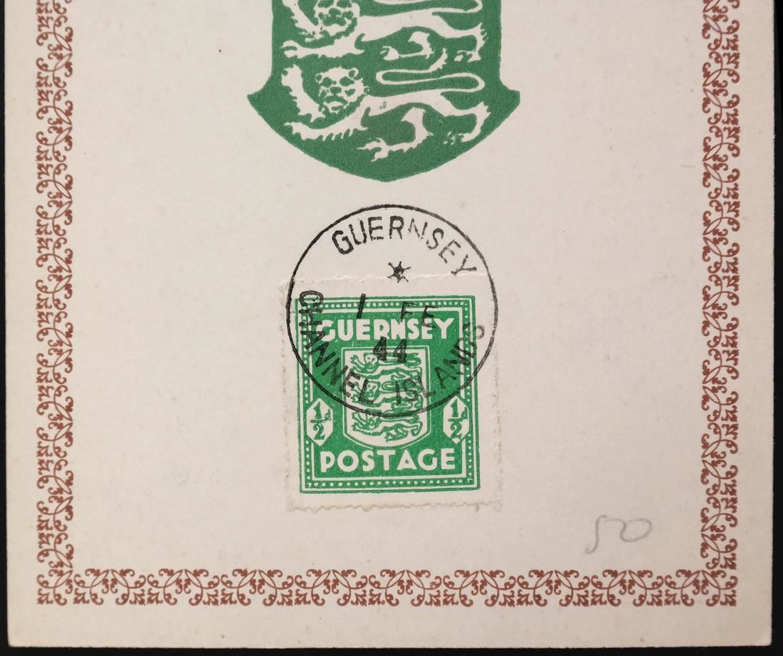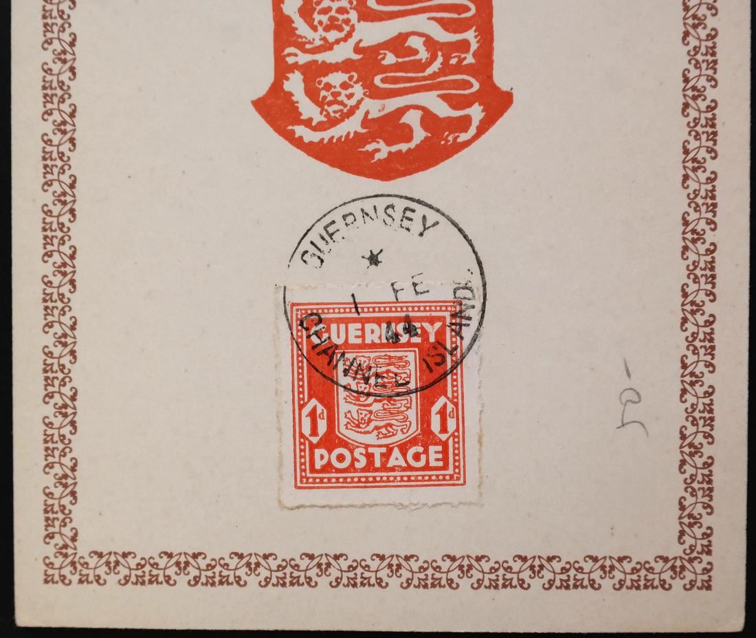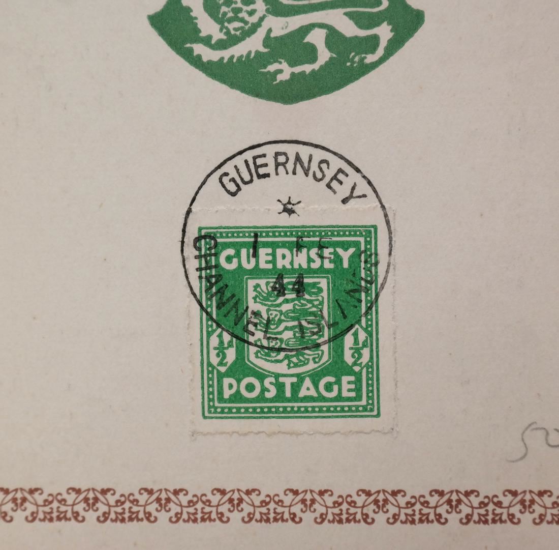 Includes Great Britain bisected 2d (Gibbons #465b) tied on cover to Jersey by 28 January 1941 Guernsey cancel, two each of the Guernsey 1/2d and 1d tied on Armoiries cards by 1 February 1944 cancels, and a pair of Jersey 1/2d tied on photo postcard by 29 January 1942 first day cancel, sound and VF.