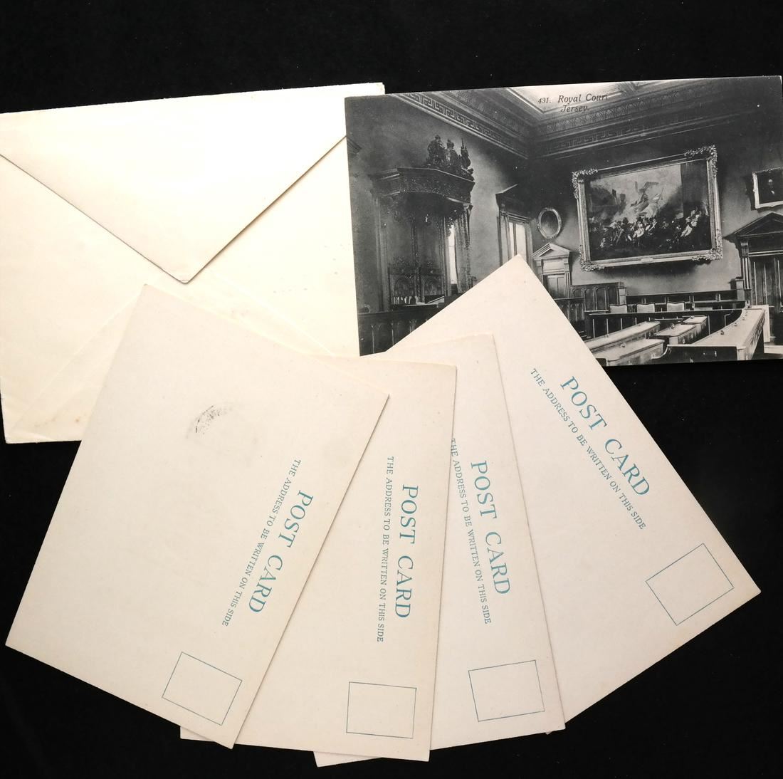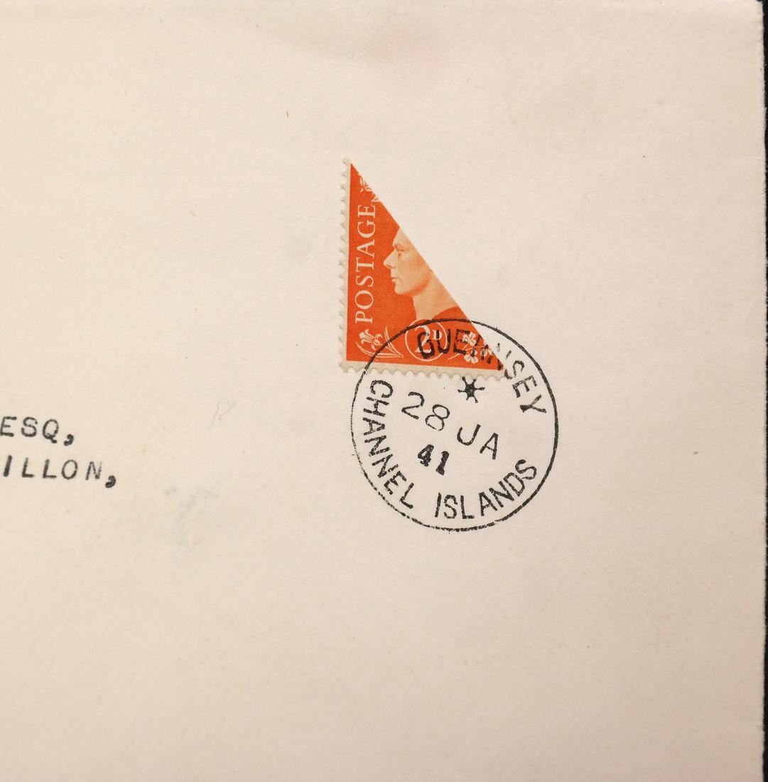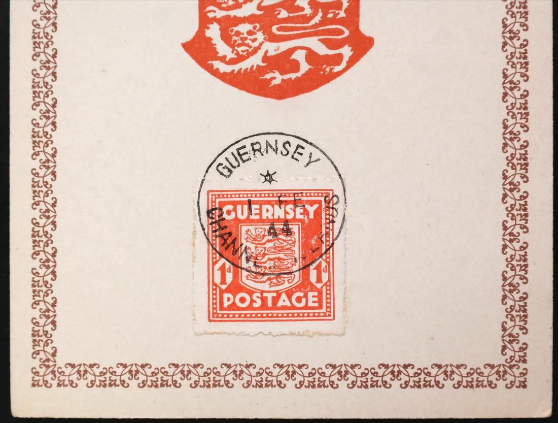 Includes Great Britain bisected 2d (Gibbons #465b) tied on cover to Jersey by 28 January 1941 Guernsey cancel, two each of the Guernsey 1/2d and 1d tied on Armoiries cards by 1 February 1944 cancels, and a pair of Jersey 1/2d tied on photo postcard by 29 January 1942 first day cancel, sound and VF.