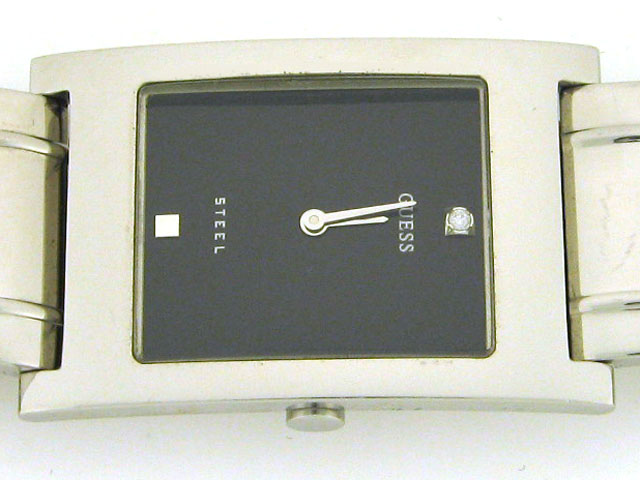 This is a GUESS STEEL DIAMOND DIAL SILVER WATCH with the following features: Japan Quartz Movement; Stainless Steel Case and Band with Push-Button Deployment Clasp; Mineral Crystal, Diamond Marker; Silver-tone hands and 1 diamond/1 silver-tone square mar