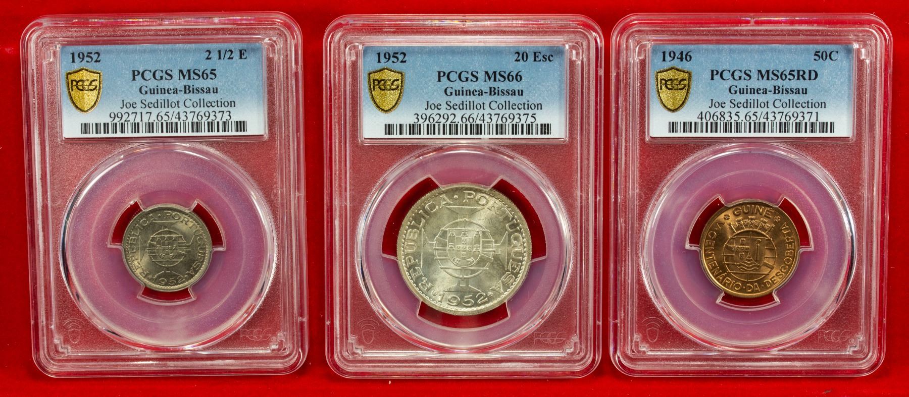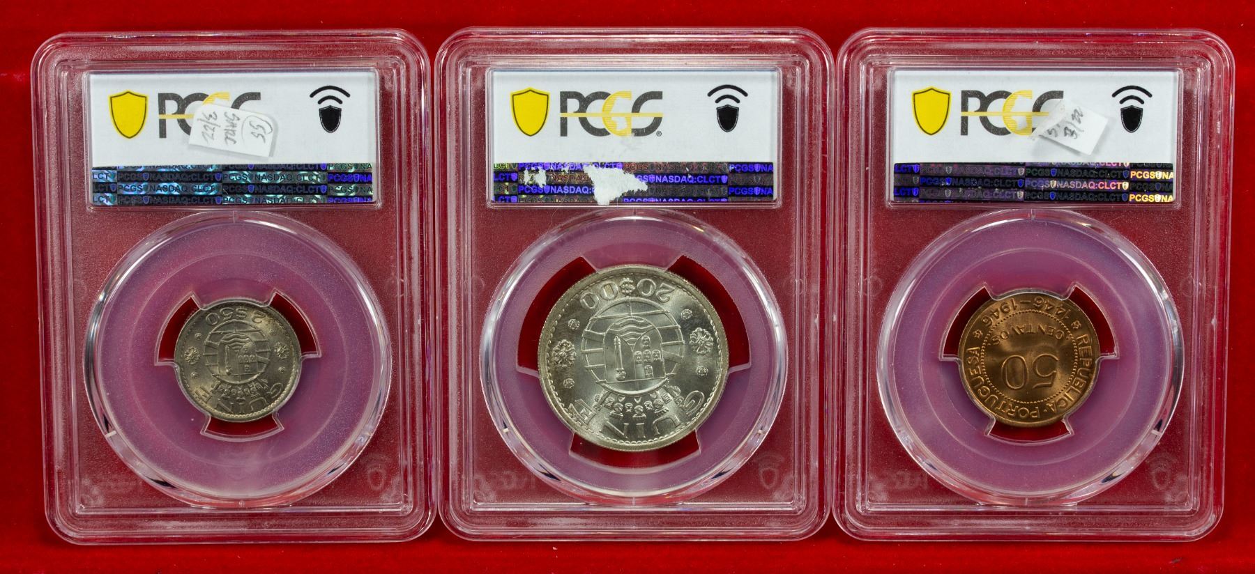 GUINEA-BISSAU: LOT of 3 certified coins, including 50 centavos 1946 PCGS MS65RD, 2-1/2 escudos 1952 PCGS MS65, 20 escudos 1952 PCGS MS66; retail value $200, lot of 3 pieces.