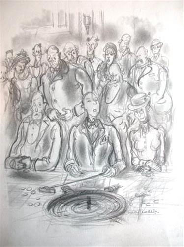 - 1 dessin original signé, ayant servi à l'illustration du hors-texte de la p. 85 et figurant une scène au casino de Monte-Carlo,