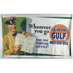 GULF MOTOR OIL CANVAS BANNER. Colorful sign featuring attendant promoting Gulf Supreme motor oil. M.C.A. Sign Company, Massillon, OH. SIZE: 60” w. x 30” t. CONDITION: Very good to excellent. PF 1-3675 (75-125)