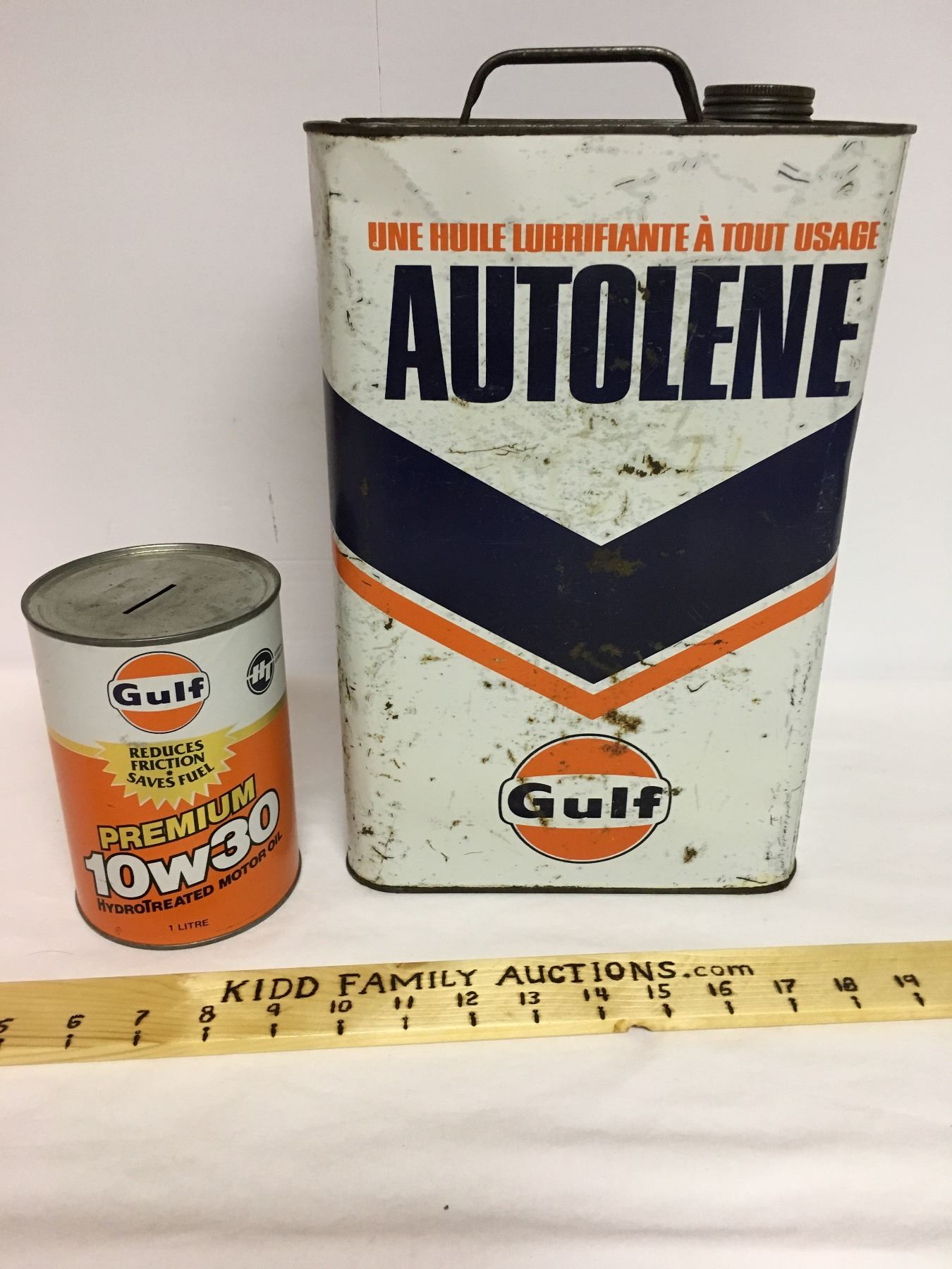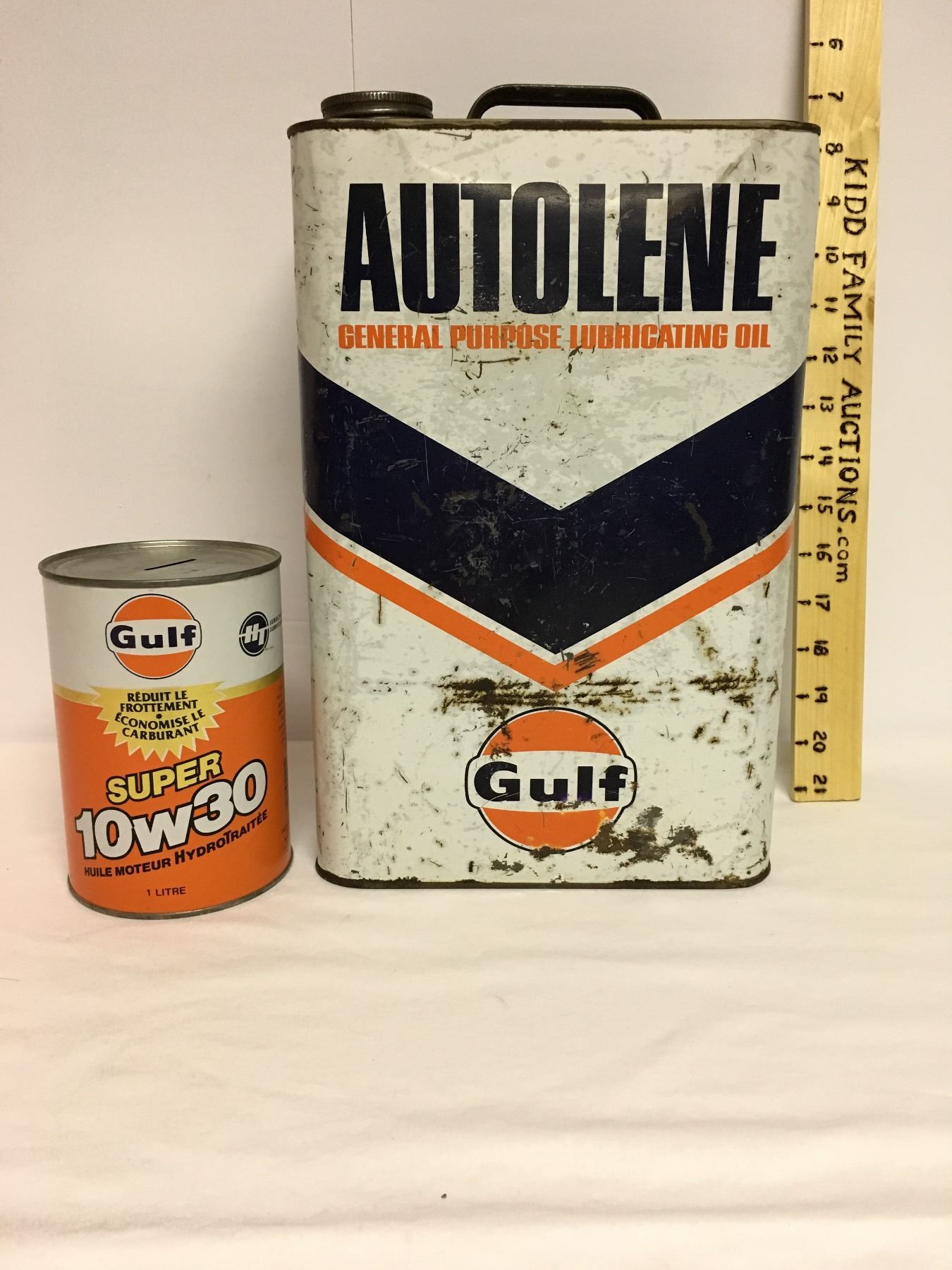 GR OF 2, GULF 10W30 TIN BANK, AND AUTOLENE LUBRICATING OIL TIN