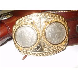 GALCO HANDMADE LEATHER GUNBELT W/DOUBLE HOLSTERS, W-TB154M, BUCKLE HAS 2 MORGAN SILVER DOLLARS: 1878 & 1898