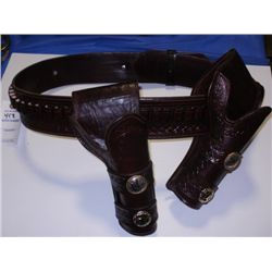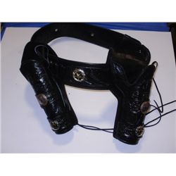 MEXICAN MADE BLACK LEATHER GUN BELT W/DOUBLE HOLSTERS W/BADGE STAR ADORNMENTS