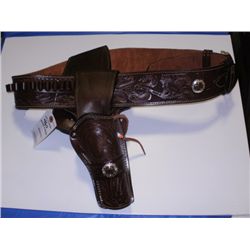 BROWN TOOLED LEATHER GUN BELT W/DOUBLE HOLSTERS, BUCKLE HAS "BEAR RIVER BOB #4717"