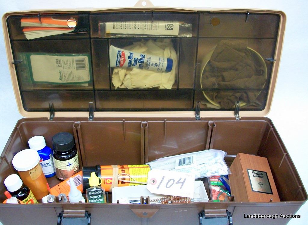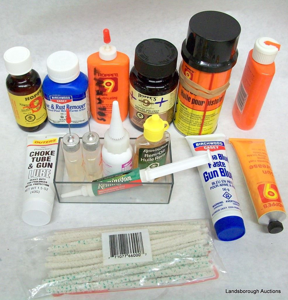 CHOKE TUBE LUBE, HOPPES GUN GREASE, HOPPES 9 GUN OIL, COPPER SOLVENT, NITRO SOLVENT, BIRCHWOOD BLUE REMOVER, PERMA BLUE PASTE, BRASS BRUSHES, TIPS, ADAPTERS. COMES IN A MTM A760 PLASTIC CASE, MUST PICK UP WILL NOT SHIP.