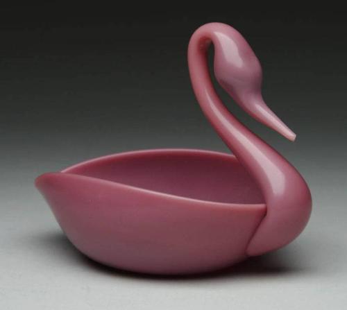 GUNDERSEN PEACH BLOW SWAN.  Extremely rare Gundersen Peach Blow Camellia swan with deep color.  Original label on underside "Fine Crystal Hand Made by Gundersen".  SIZE:  5-1/2" t to top of swan's head.  CONDITION:  Very good to excellent.  5-62183