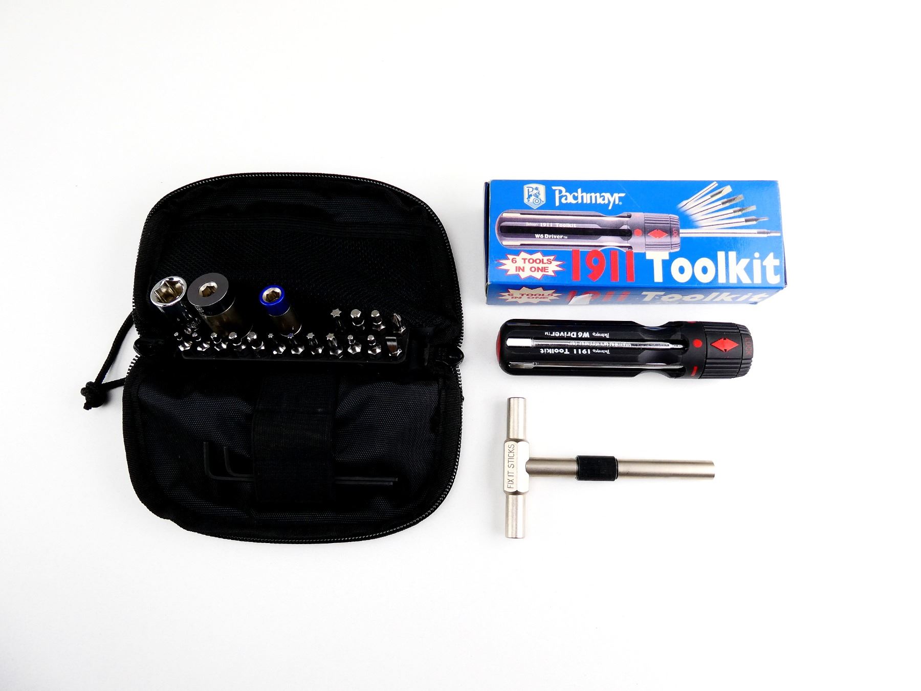 LOT INCLUDES; (1) PACHMAYR 1911 TOOLKIT, 6-TOOLS-IN-ONE, WITH ORIGINAL PACKAGING & (1) FIX-IT-STICKS TOOL KIT WITH TORX & ALLEN BITS, 1/2" SOCKET, ETC. SEE PHOTOS.