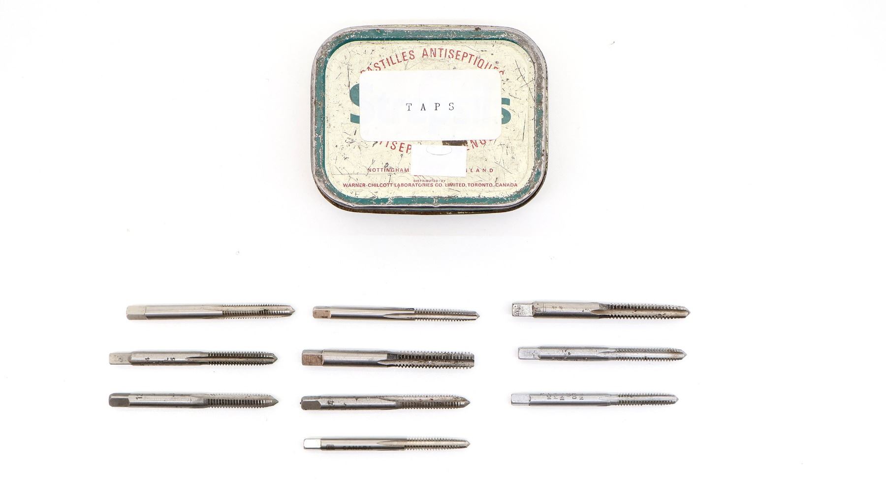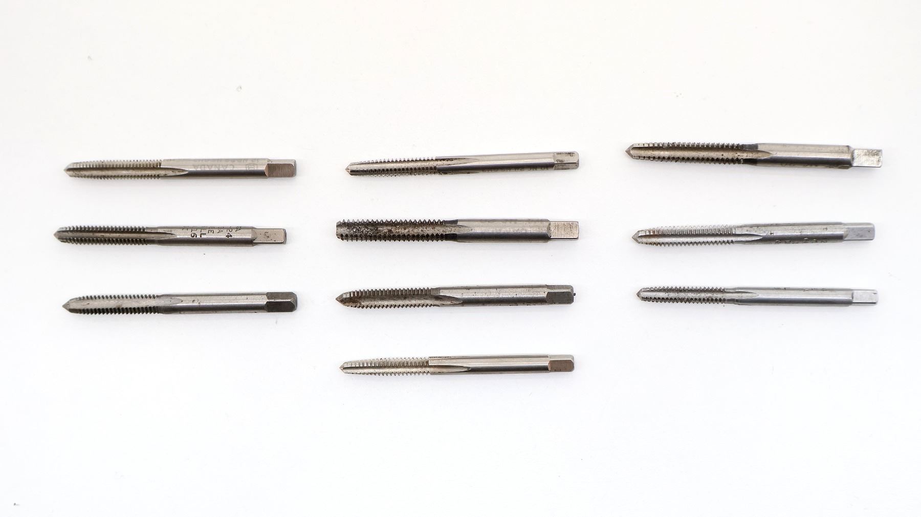 LOT INCLUDES; (10) GUNSMITHING TAPS, INCLUDES; 1/4 NC 20, NO. 16 12-24, 10 NC 24 & NO. 25 10-24, ETC., IN METAL TIN. SEE PHOTOS.