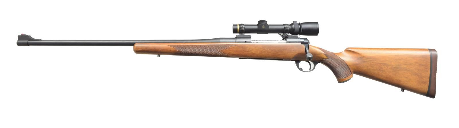 RIFLE BY PAUL JAEGER. Cal. .338 Win. Mag. S# 63141. Bbl. 24". Jim had this rifle built by Paul Jaeger for a month long safari to Mozambique in 1972. It is fitted w/ 24" Douglas medium weight sporter bbl. A steel detachable hinged floorplate w/ release button in trigger guard bow was installed & rifle was stocked in French walnut in Jaeger's classic style. According to Jim "in August 1972, this rifle accounted for 29 head of game for 30 rds. expended. A cape buffalo was given a "safety shot" to ensure the animal was indeed dead." Jim also further states that the rifle was refinished later by Gary Stiles & fitted w/ a front sight ramp & a Redfield flip up auxiliary rear sight. Metal parts are black teflon coated. Rifle is fitted w/ Leupold Vari-X III 1.5x5 scope w/ crosshair & dot reticle in Redfield rings & bases. A Pilkington QD lever was fitted to rear base. UNATTACHED ACCESSORIES: included w/ rifle is orange Conico storage container w/ RCBS dies, some fired cases, & a large variety of .338 caliber bullets, including 2 open boxes of 200 grain spire point bullets by Hornady, 2 boxes of full metal jacket by Hornady, 5 boxes of 250 grain Nosler Spitzers, 1 box & a partial of Nosler 250 grain rnd. nose, a box of Barnes 225 grain "X" bullets, & 2 boxes of Barnes 300 grain rnd. nose full metal jacket. Also included is a typed description by James Fender. CONDITION: very fine as refinished. Metal parts have only a few minor scratches in their teflon coating, mostly on floorplate. There are only 1 or 2 minor marks in stock finish. Bore is excellent. Scope is very fine, optically clear. (20-2399/MGM65). MODERN. $1,500-2,500.