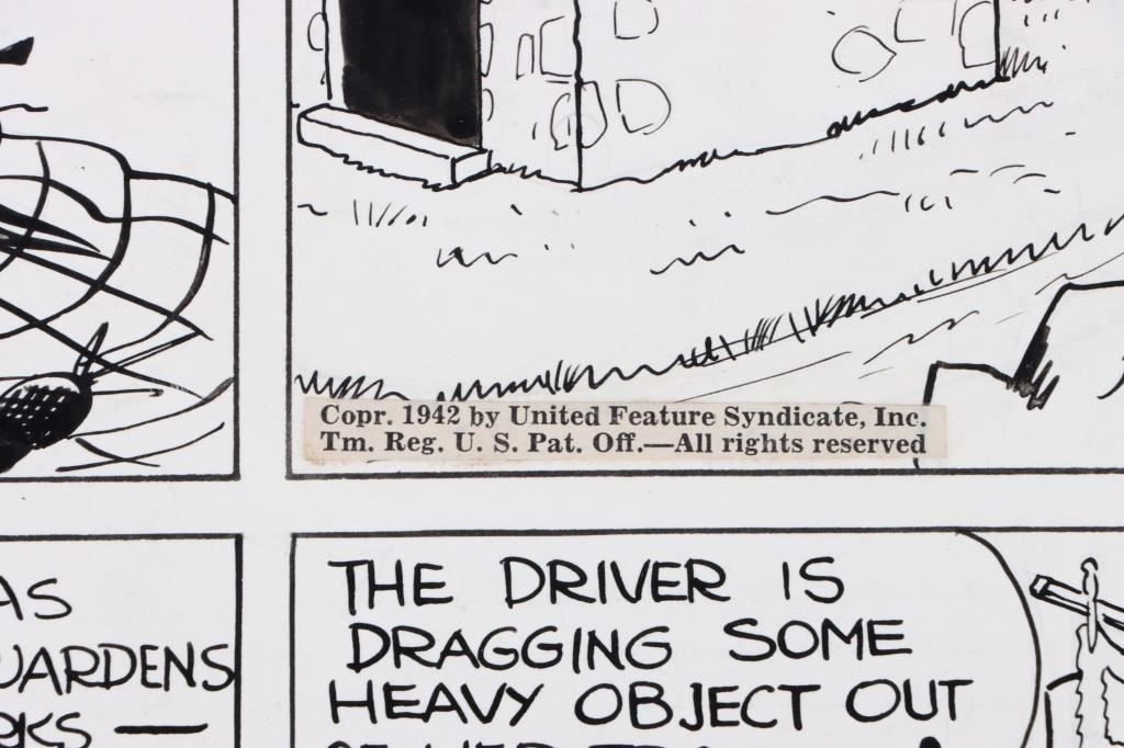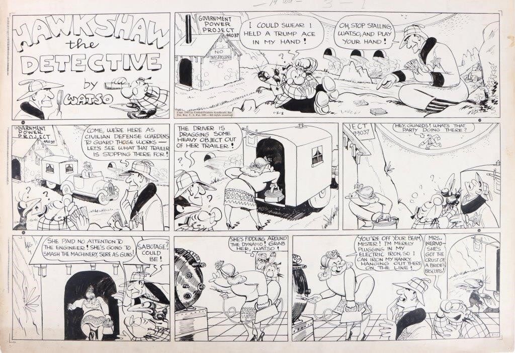 Gus Mager - Hawkshaw the Detective Sunday Comic Strip Original Art, dated 3-1-42 (United Feature Syndicate, 1942). Guarding a government power project is tough work for Hawkshaw and Watso, when a suspicious woman shows up brandishing an electric iron! This Gus Mager Sunday has an image area of 22.5" x 14.5", and, aside from some light aging, the condition is Very Good.