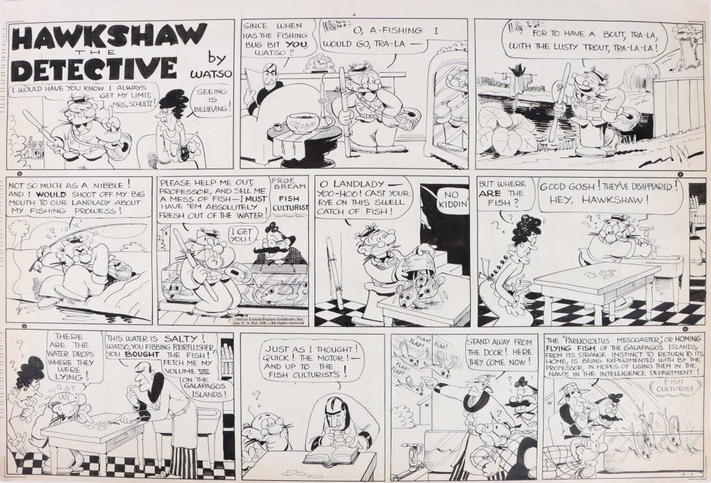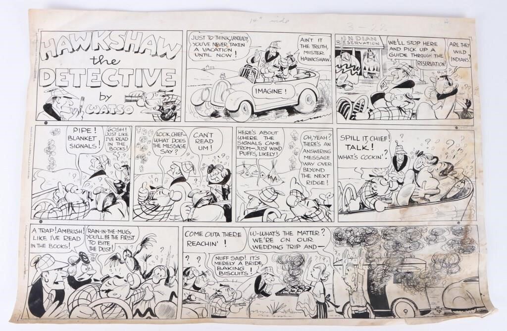 Gus Mager - Hawkshaw the Detective Sunday Comic Strip Original Art, dated 1944 (United Feature Syndicate, 1944). This Gus Mager Sunday comic strip art has an image area of 22.5" x 14.5". Includes 2 pieces of original art by Gus Mager.